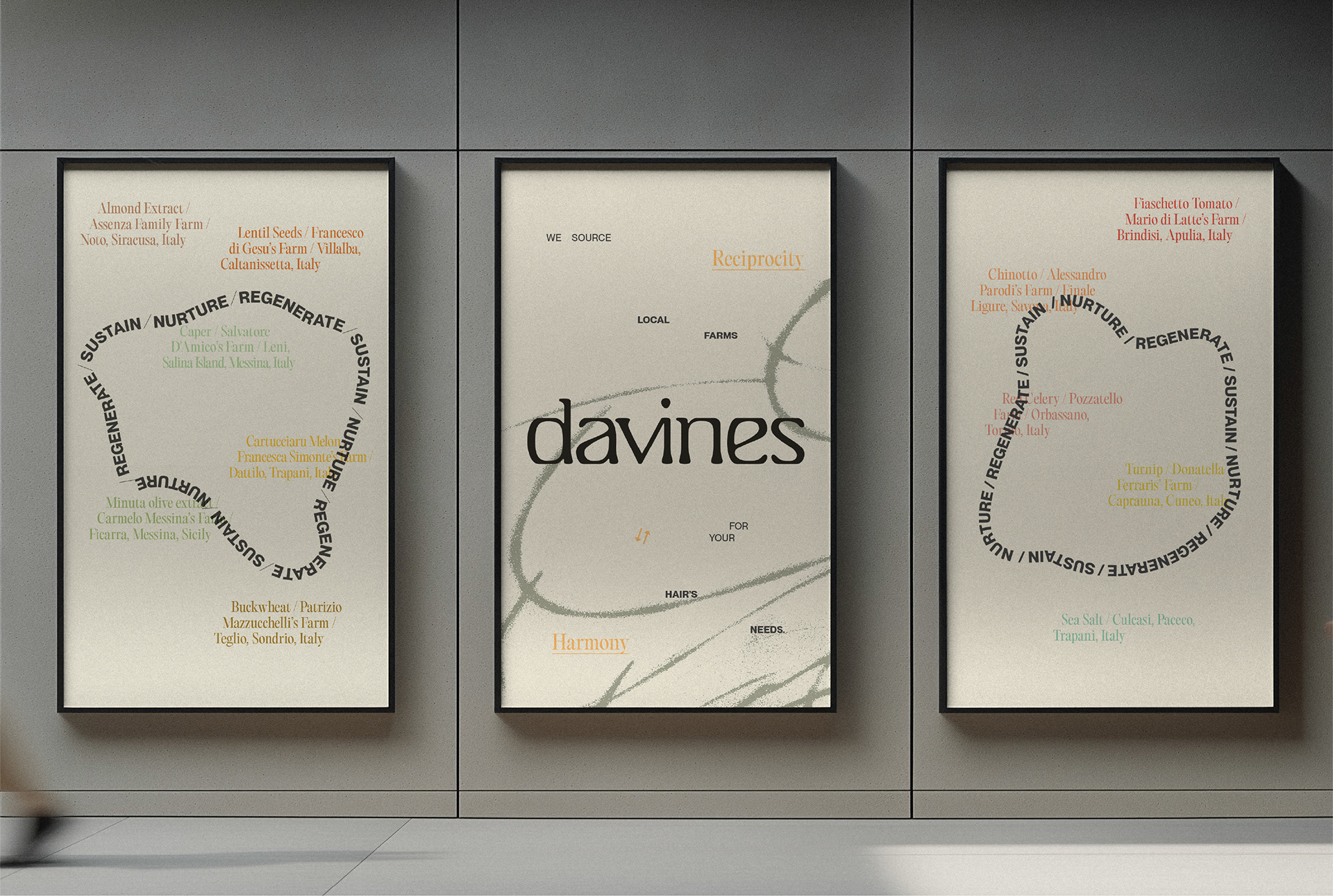 A bespoke word mark, swirling abstract forms, grainy photography, and paper surfaces communicate the brand's unique positioning as both a nature & science-focused beauty brand. Additional advertising and web components vocalized Davines' work with local farms for their products.