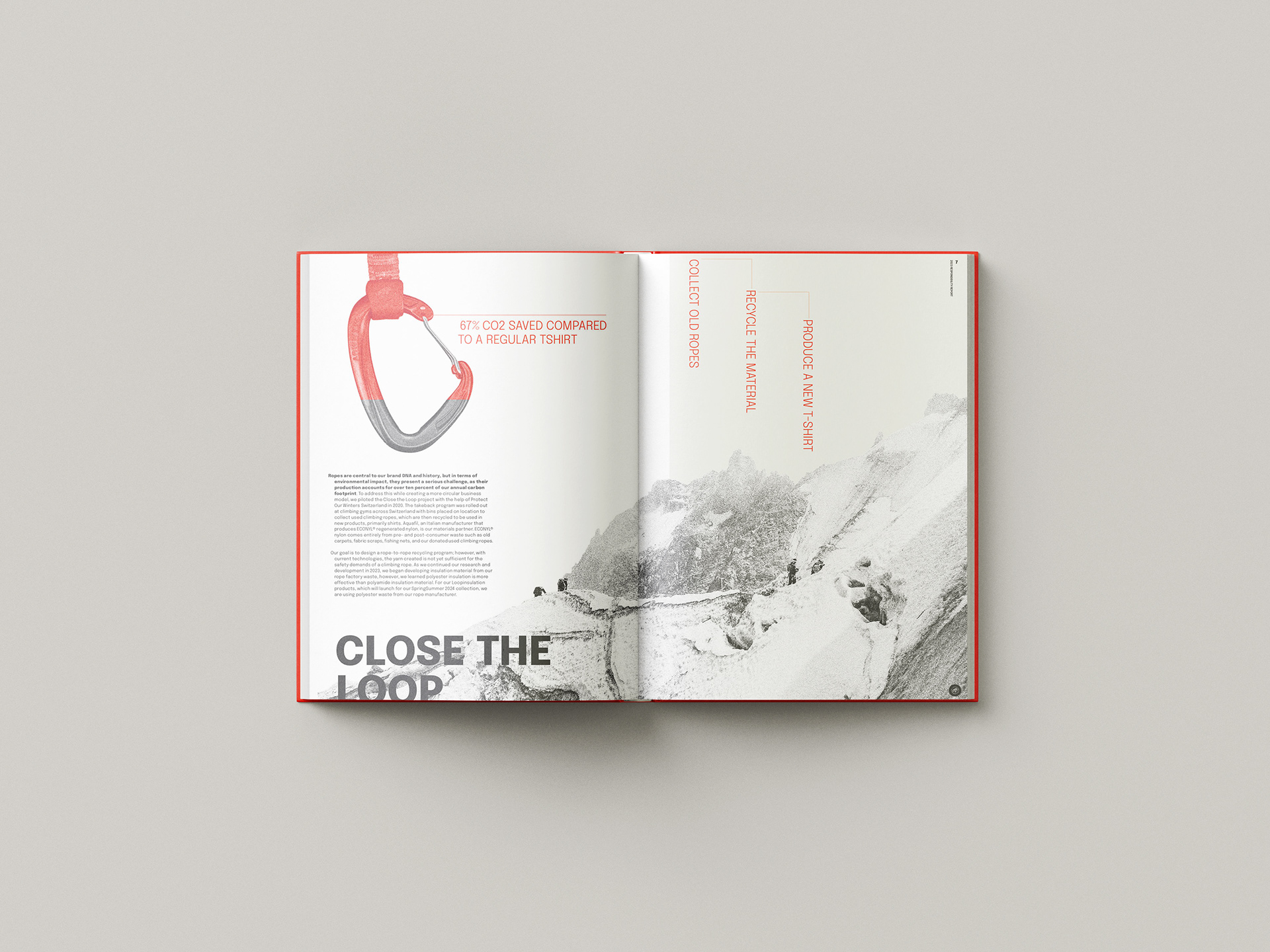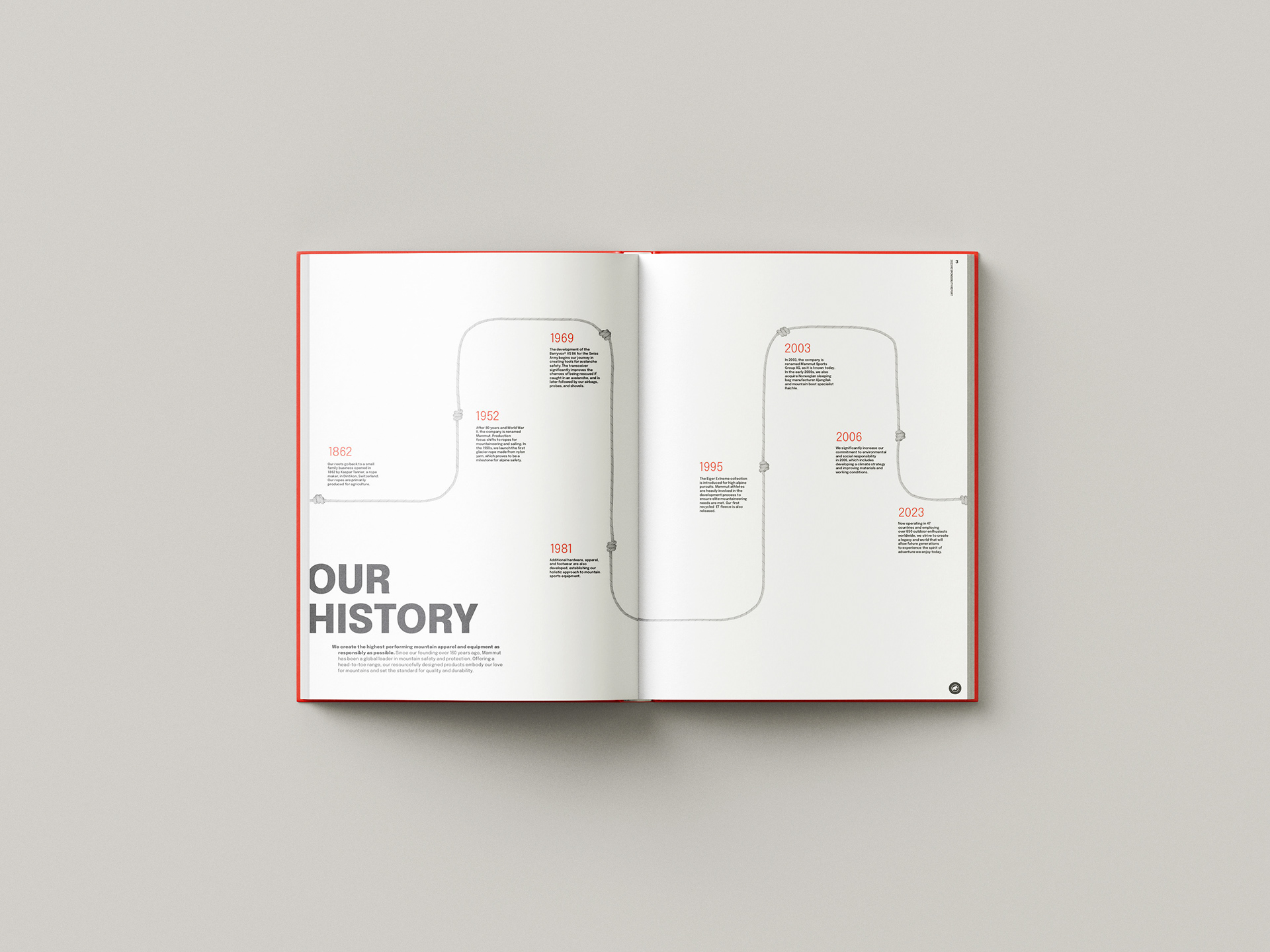 We decided on using color that was reminiscent of their Swiss origins, and typographic layouts that emulated the uneven elements of climbing rock and ice walls through hanging indents and contrasting paragraph shapes/alignments.