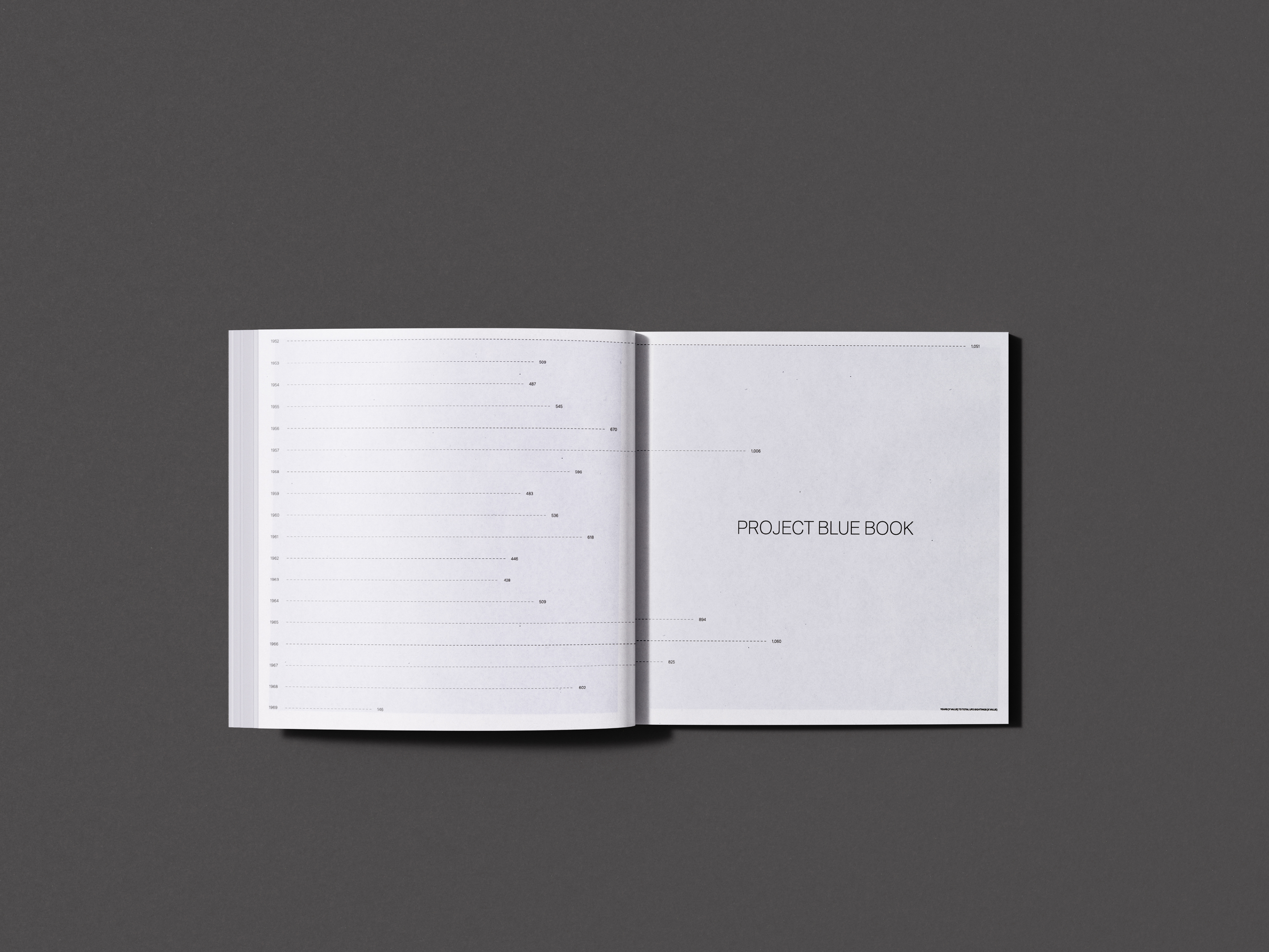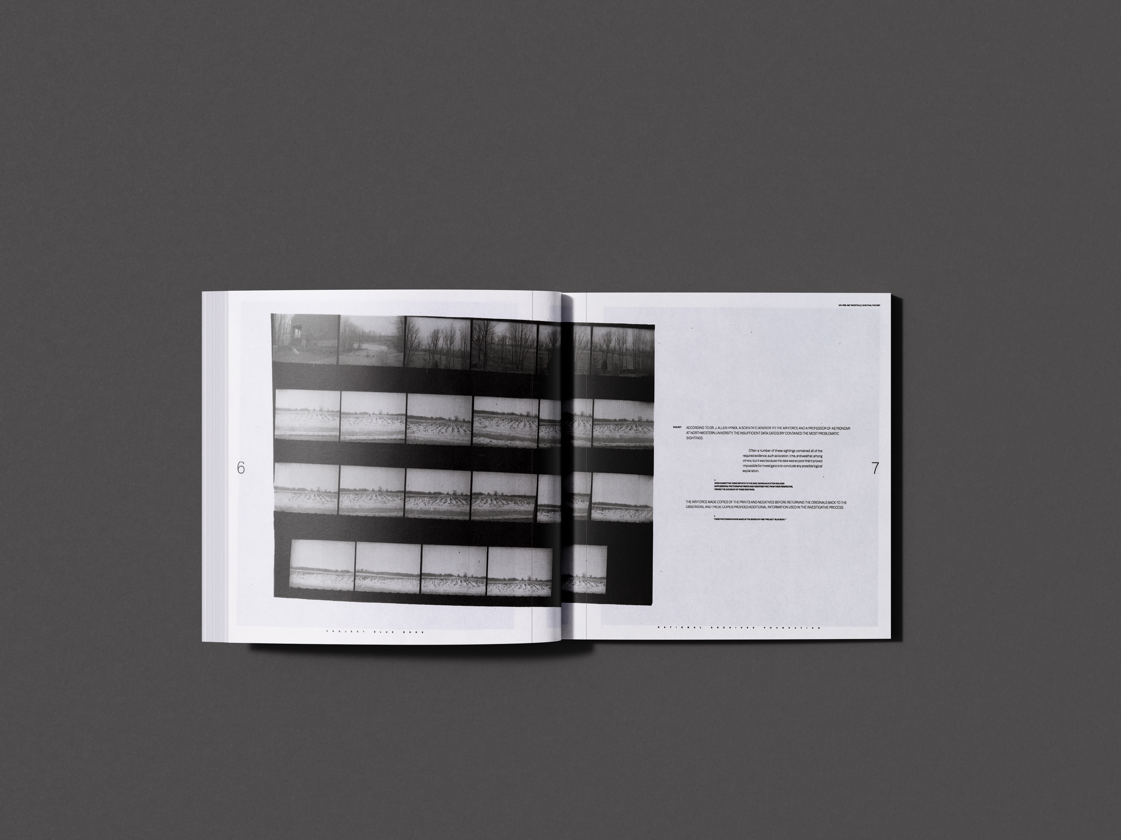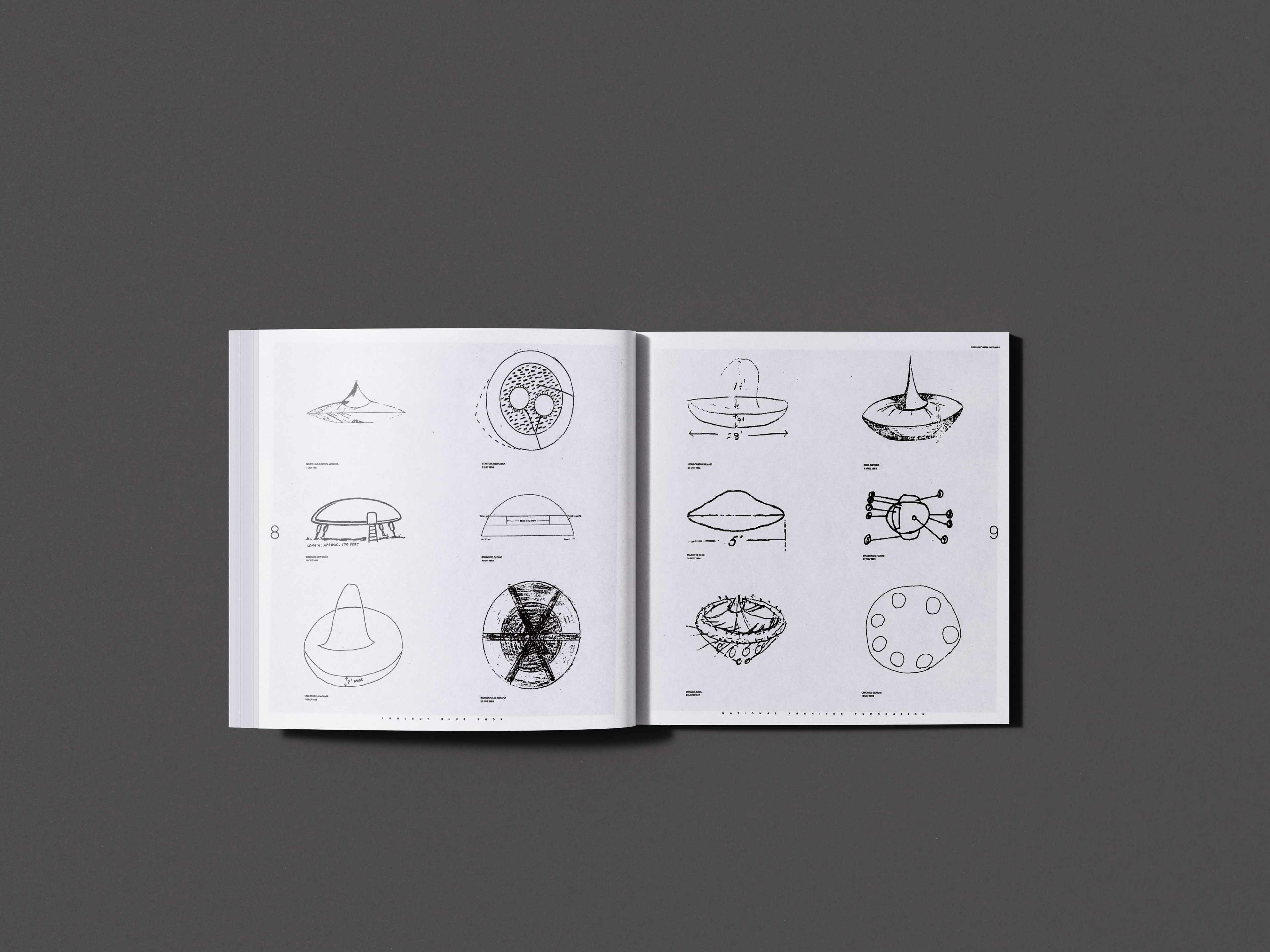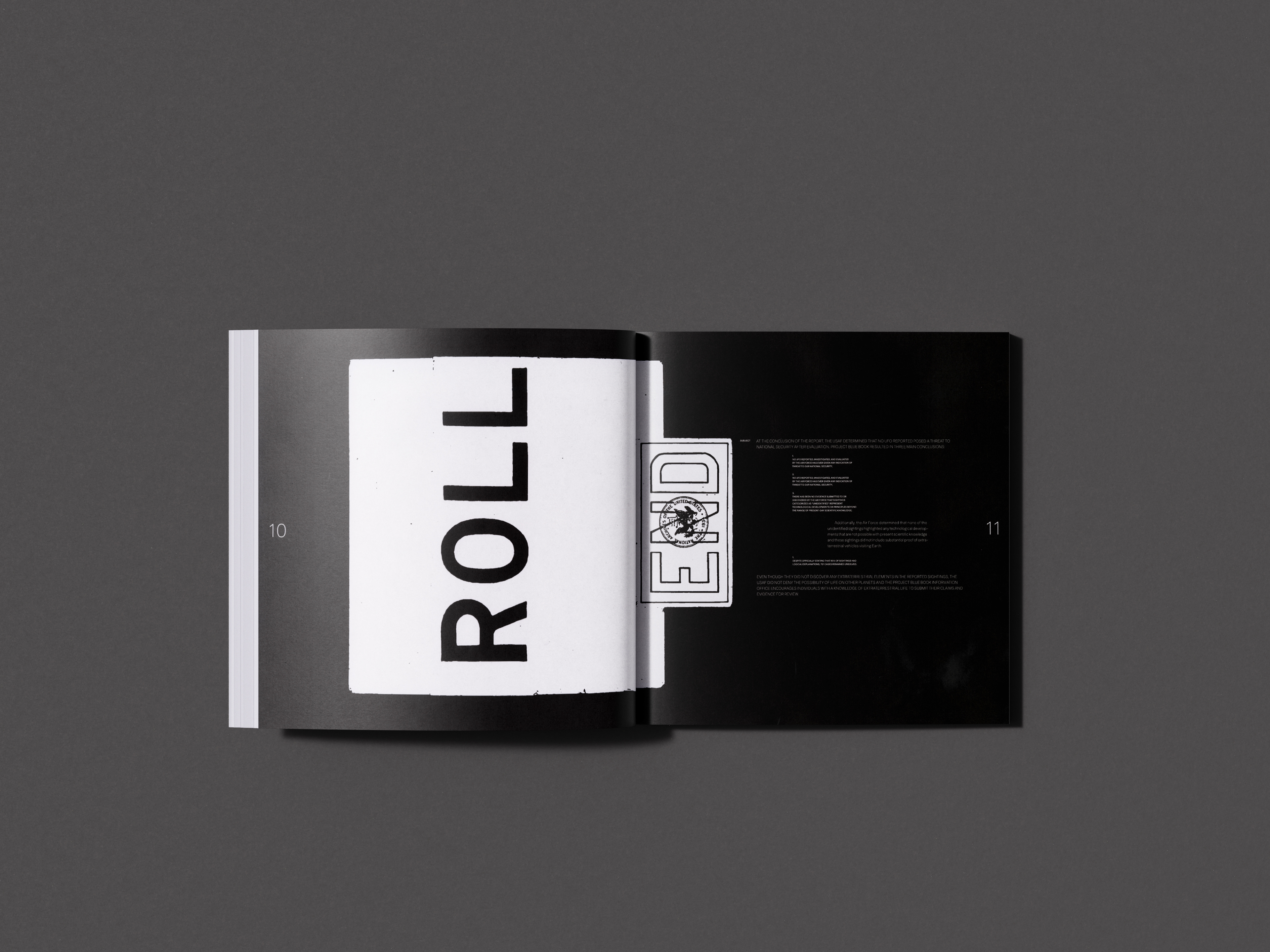 The book's 12" x 12" dimensions, shifting typographic forms, and photographic content invoke an uncanny user experience for the reader, mimicking the high emotions experienced during the UFO craze. Spreads were inkjet printed onto tabloid paper and scanned at high resolution to capture the grain of inkjet dot patterns. Analog textures within the publication reinforced themes of cognitive dissonance and distorted communication.