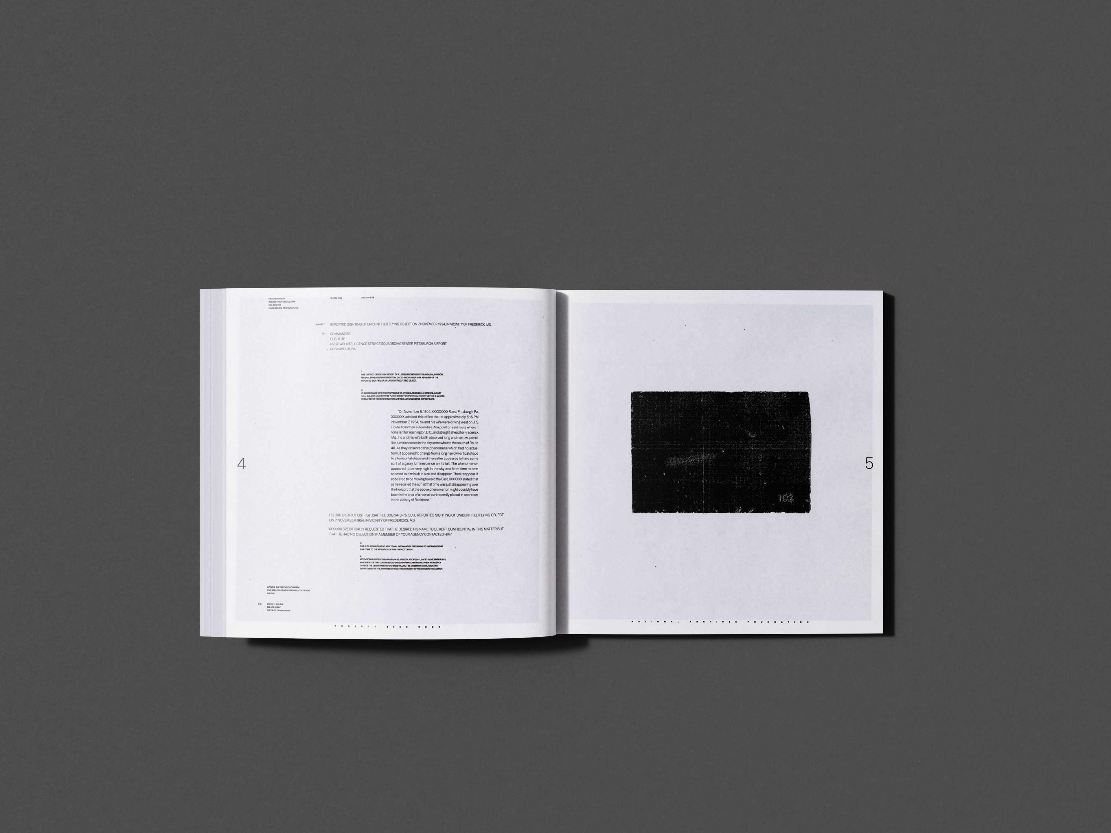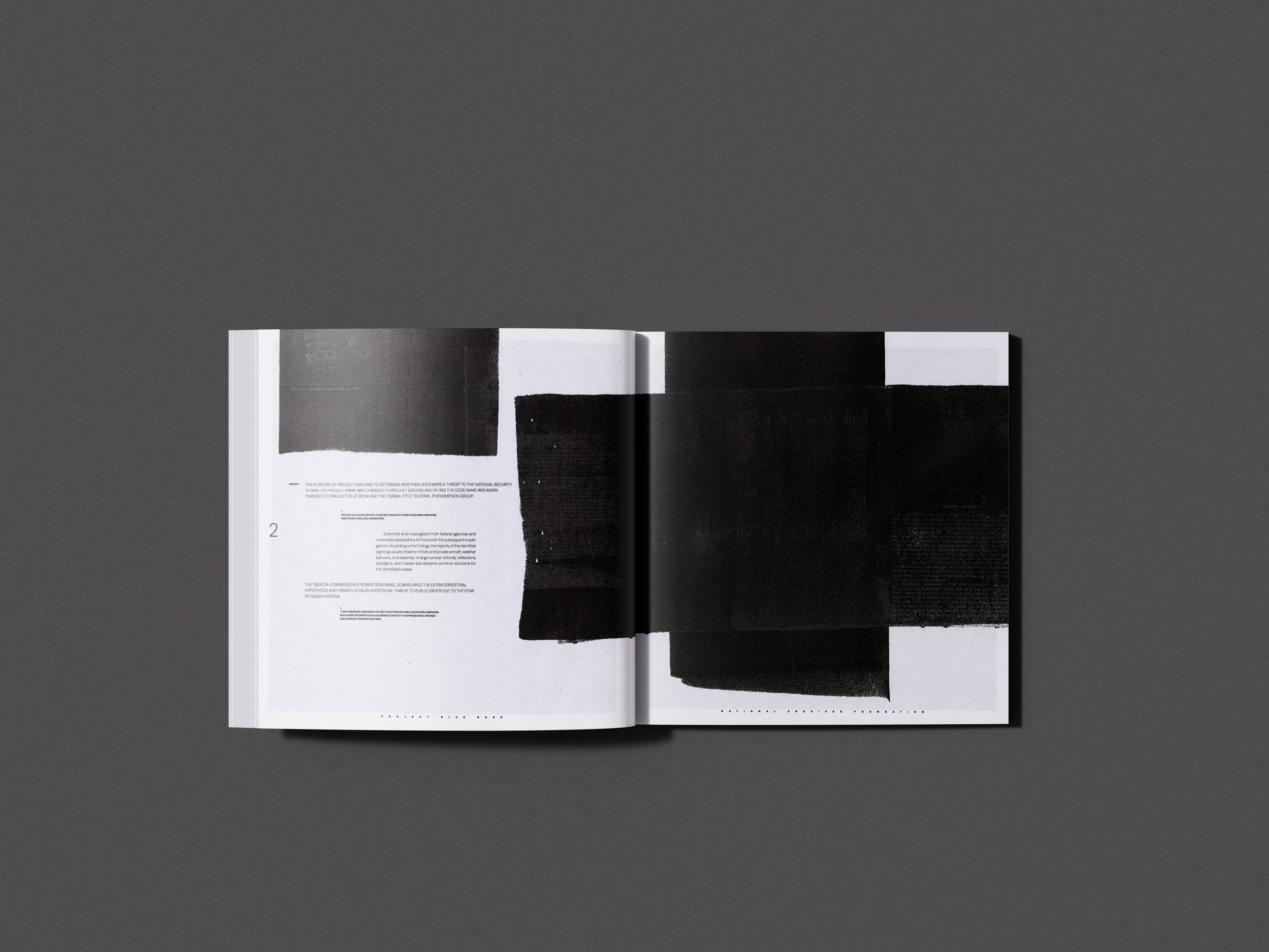 This assignment entailed creating a publication from a topic of our choosing, prioritizing the demonstration of typography and layout skills. I decided to create a publication for the National Archives Foundation to tell the story of "Project Blue Book": a decade-long period of international UFO investigations conducted by the United States. Source text and photography were curated and edited from the hundreds of thousands of creative commons materials in the National Archives.